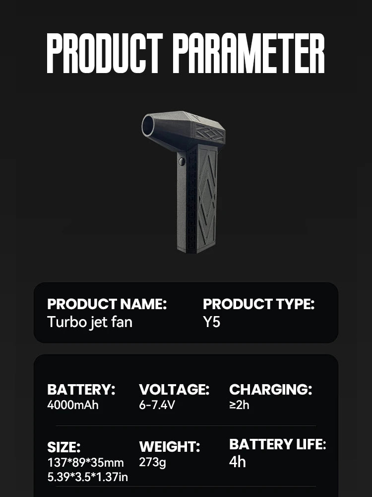 The TurboWind Pro is a high-performance handheld turbine fan designed to keep you cool on the go, also revolutionize your BBQ game. With its sleek, lightweight design and powerful 130,000-turn turbine, this rechargeable fan delivers a refreshing breeze wherever you are. Its compact size makes it perfect for travel, outdoor activities, or even daily commutes. The fan is USB rechargeable and boasts a long-lasting battery, ensuring hours of cooling relief. Whether you're camping, at the beach, or just out and about, the TurboCool Pro is your portable solution to beating the heat.